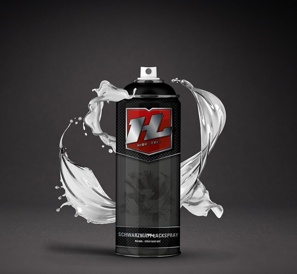 Dieser Schwarzmatt-Lackspray hat gute Deckkraft mit schneller Trocknung und hoher Ergiebigkeit. Daraus ist der HighLevel Schwarzmatt-Lackspray entstanden: